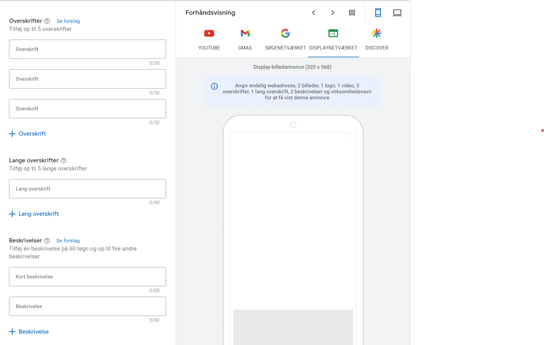I din kampagne skal du også vælge overskrifter og beskrivelser. Dette er vist på følgende skærmbillede.