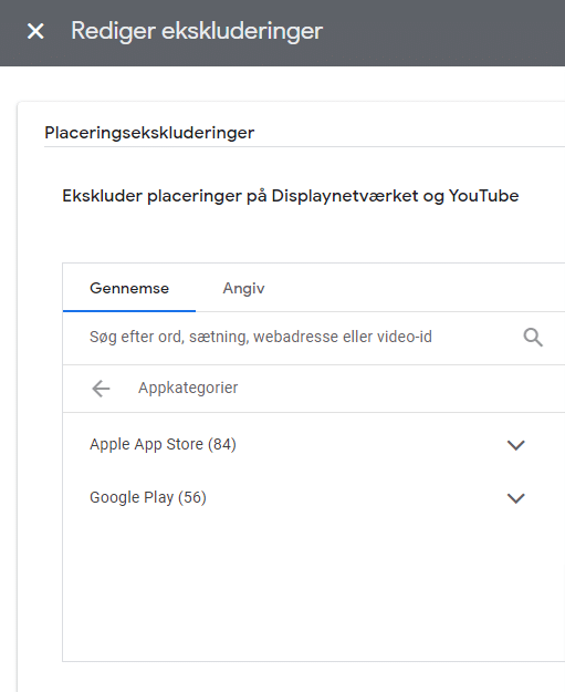 Vi ser ofte, når vi overtager arbejdet med Google Ads på en aktiv konto, at virksomheden er synlig med annoncer i forskellige apps. Rigtig mange klik fra apps er enten fra spil-apps eller fejlklik. Derfor er noget af det første, vi gør, at ekskludere disse placeringer, så annoncebudgettet allerede fra begyndelsen bliver optimeret. Placeringer på apps er ikke kun en udfordring på displaykampagner, men også i performance max-kampagner, hvor man ikke som standard kan se, hvilke placeringer ens annoncer bliver vist på, men hvor det stadig er muligt at ekskludere appkategorier. Dette er muligt at gøre på kontoniveau under ”Indhold”. Det er vigtigt, at man får klikket alle 140 app-kategorier af i sin ekskludering.