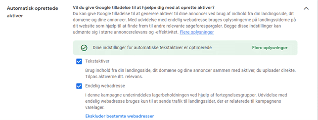 Det er dog fortsat vigtigt, at man sætter grænser for, hvilke sider kampagnen må sende trafik ind til, da kampagnen nemlig selv finder søgeord, som, den vurderer, kan være relevante. Dette kan gøres ved at klikke på ”Indstillinger” på performance max-kampagnen og herefter på ”Automatisk oprettede aktiver”. Her kan man ekskludere bestemte web-adresser på siden. Dette indikerer overfor Google, at den ikke må finde søgeord og sende folk ind til f.eks. handelsbetingelser-siden.