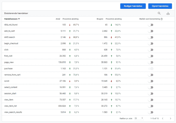 Alle disse events er nogle, som Google Analytics 4 selv har registreret på siden. Ud af dem kan man frit vælge dem, man finder relevante, og bruge dem som konverteringer. Man har mulighed for at redigere i disse events, hvis man eksempelvis ledte efter bestemte kliks på en bestemt side.