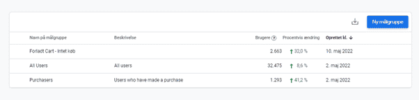 At oprette målgrupper er blevet meget nemmere og mere overskueligt, end det var tidligere. Ligesom ved events, så opretter GA4 selv nogle klassiske målgrupper som set her: