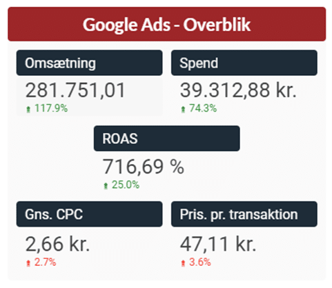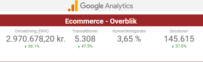 En anden kunde i vores forretning – inden for personlig pleje og med samme sammenligningsforudsætninger, dog her med data fra alle kanaler og ikke blot Google Ads – har også succes online på trods af de negative tal i Pricerunners undersøgelse. Her er den totale omsætning mere end fordoblet ift. sidste år i samme periode. Her skyldes det som tidligere nævnt netop, at vi for kunden har identificeret markedets spillere, konkurrencen imellem dem og pinpointet de medier, hvor vi via data kan identificere største potentiale for vækst, og hvor de øvrige har sovet i timen.